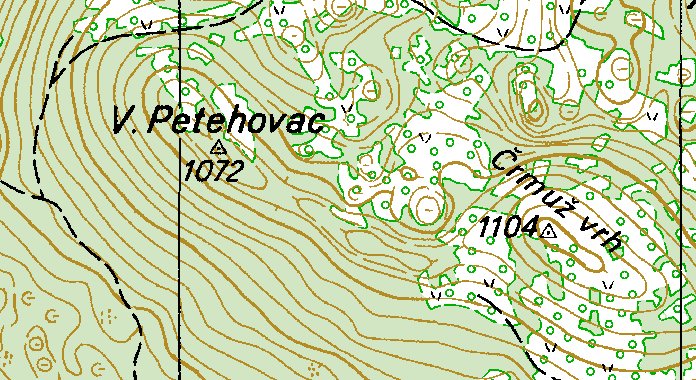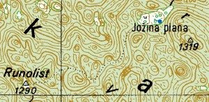 Zanimljivo je usporediti izohipse oko Runolista i Bitoraja sa onima na zadnjim vrhovima, Petehovcu i Črmužu (klik na isječke topo-karata otvara iste u većem formatu).